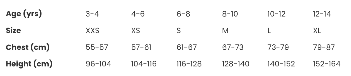 3-4, 4-6, 6-8, 8-10, 10-12, 12-14, XS, S, M, L, XL